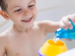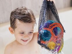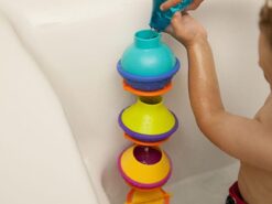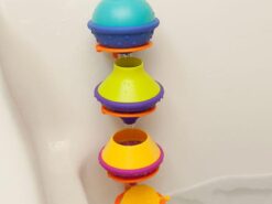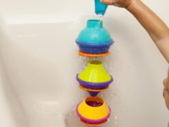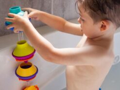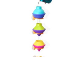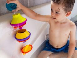 Zestaw trzech kubeczków oraz młynka, przez które przelewa się woda w różny sposób, o różnej prędkości. Zabawki można przyczepić do wanny lub ściany, nakładając na pierścienie posiadające mocne przyssawki.