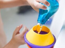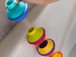 Jeden kubeczek sprawia, że woda kapie jak delikatny deszczyk, drugi tworzy duże krople, a przez trzeci wada płynie stałym strumieniem, który może napędzić wiatraczek. Poeksperymentuj z ustawieniem kubeczków, możesz zmieniać je w dowolnej kolejności lub bawić się z nimi oddzielnie. Podstawa kubeczków zrobiona jest z miękkiego silikonu o różnej fakturze.