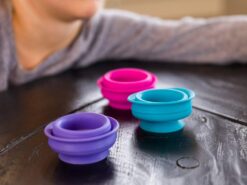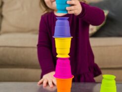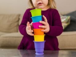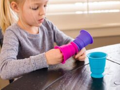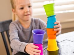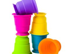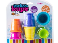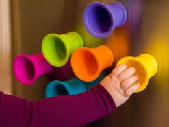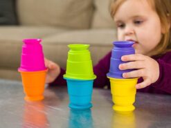 Układaj, zgniataj, przysysaj sześć miękkich, silikonowych kubków, które można przyklejać z obydwu stron do siebie i gładkiej powierzchni. Każdy z tych miękkich i pięknie kolorowych kubeczków, ma w podstawie przyssawkę, dzięki czemu kubeczki przysysają się do siebie oraz gładkich poziomych i pionowych powierzchni jak lustro, okna, wanna, drzwi lodówki i wiele wiele innych. Kubeczki wykonane są ze 100% silikonu, dlatego są bezpiecznie i można także z nich pić i jeść.