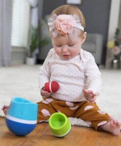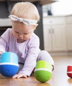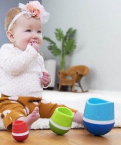 Trzy kolorowe Przewrotki każda innej wielkości mają obciążoną podstawę, aby się kołysały, przechylały, turlały. Elementy mają różną fakturę, aby dodatkowo stymulowały malucha. Włóż Przewrotki jedną w drugą i patrz, jak się przewracają i wypadają, kręcąc się i kołysząc fascynując dziecko ruchem. Dla dzieci 10 m-cy +.
