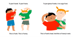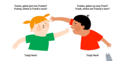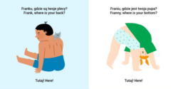 W tej książce ćwiczymy zadawanie prostego pytania: „Gdzie jest…?” i udzielanie na nie odpowiedzi. Książka wprowadza słowa opisujące poszczególne części ciała, a więc to, co dziecku najbliższe. Pretekstem do wprowadzania nowych pojęć jest kąpiel, do której przygotowuje się rodzeństwo, Franek i Frania. A co robi Felix? Czy kot również lubi kąpiele? O tym można się przekonać, zaglądając do książki.