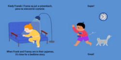 Franek, Frania & Felix to seria kartonówek dla najmłodszych skonstruowana w taki sposób, by otwierała na kontakt z językiem obcym oraz – a może przede wszystkim – dawała przyjemność z obcowania z książką. Można ją czytać po polsku lub po angielsku, a także puścić wodze fantazji i tworzyć własne historie o sympatycznych bohaterach.
