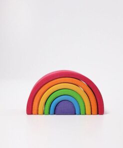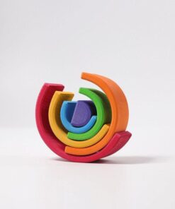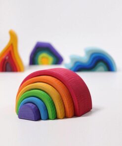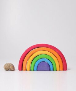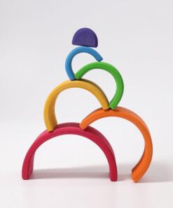 Tęcza ma w sobie coś magicznego. Dzieci uwielbiają przyglądać się jej, gdy pojawia się na niebie po letniej burzy. Chętnie słuchają i uczą się o tym jak powstaje, fantazjując jednocześnie o bajkowej krainie po jej drugiej stronie. Jeżeli dostaną do rąk swą własną tęczę, na pewno się ucieszą. Te kolorowe drewniane łuki Grimm’s kryją w sobie znacznie więcej możliwości niż mogłoby wydawać się na pierwszy rzut oka. Dziecko może ustawić z nich tęczę i odkryć w jakiej kolejności układają się kolory. Może stworzyć z nich barwny tunel dla aut. Drewniane łuki przy odrobinie cierpliwości i fantazji można na wiele sposobów ustawiać jedne na drugich. Każdy z nich da się również wykorzystać jako element konstrukcji powstającej z innych klocków. Dzieci chętnie zamieniają je w kołyski dla lalek lub ogrodzenie dla “zwierzaków”. Tak naprawdę to co powstanie z Tęczy Grimm’s zależy wyłącznie od kreatywności dziecka, bo siła tkwi w prostocie.