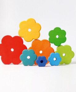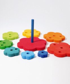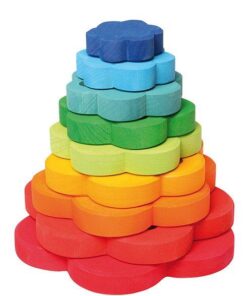 Wieża to oczywiście nie tylko walory estetyczne. To przede wszystkim świetna zabawka. Dziecko może układać ją na różne sposoby. Może zrezygnować z podstawki i bawić się krążkami oddzielnie. Może je segregować. Może łączyć z innymi klockami i zabawkami Grimm’s wykorzystując jako element bardziej skomplikowanych konstrukcji lub przypisując im dowolną wymyśloną przez siebie funkcję. Ciekawym rozwiązaniem jest umieszczenie w kwiatkach miejsc na świeczki, cyferki lub figurki Grimm’s (dostępne oddzielnie). Podczas wszystkich tych aktywności maluchy trenują swoje zdolności manualne, uczą się precyzji ruchów, koordynacji “oko-ręka”.