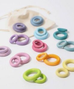 Kolorowe pierścienie Grimm’s bardzo dobrze współgrają z drewnianymi kulkami i guzikami Grimm’s. W połączeniu z figurkami tworzą intrygujące zestawienia. Mogą posłużyć jako pomoc dydaktyczna podczas nauki kolorów, liczenia a także do ćwiczenia dłoni poprzez manipulowanie nimi. Idealne do sortowania i nawlekania. Pozwolą również na tworzenie fantastycznych wzorów i obrazków na stole lub podłodze.