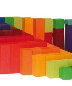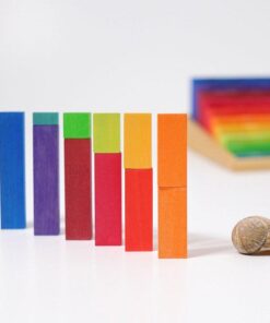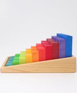 Tęczowe schody, to zestaw 100 klocków, który zachwyca jeszcze przed wyjęciem ich z ramki. Doskonale wykończone drewno, piękna kompozycja kolorów, przenikające przez bejcę słoje, to energetyczna ozdoba każdego dziecięcego pokoju. Jednak długo w pudełku nie zostaną bo chyba nie znajdzie się dziecko, które powstrzyma się przed natychmiastowym przystąpieniem do zabawy. W końcu to klocki, czyli jedna z najbardziej kreatywnych pobudzających i uniwersalnych zabawek.
