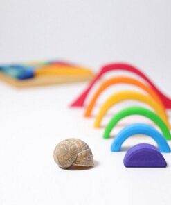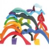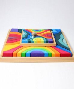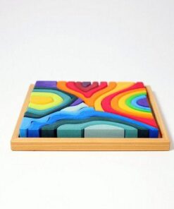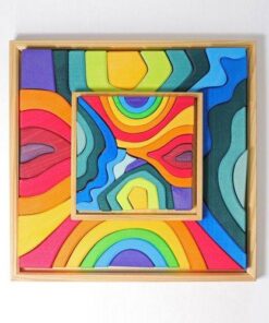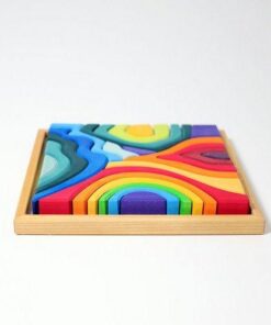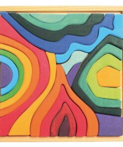 Tęczowy zestaw klocków Grimm’s to piękna drewniana układanka dla dziecka, która skrywa małą tajemnicę. Można “wyczarować” z niej znacznie więcej niż jeden abstrakcyjny widoczek. Wystarczy wyjąć wszystkie elementy z ramki by tęcza, fale i płomienie zaczęły żyć własnym życiem i zmieniały się zgodnie z wolą dziecka. Nieszablonowe kształty i nasycone kolory pozwolą tworzyć mniej lub bardziej skomplikowane wzory i obrazki. Co więcej, każdy klocek tej układanki zaprojektowano tak by nadawał się do wznoszenia nietuzinkowych konstrukcji. Gdy do elementów z tego zestawu dołączą inne klocki i zabawki dziecko czeka fantastyczna i bardzo kreatywna zabawa. Może nawet stworzyć scenografię do wymyślonych przez siebie zabaw i historyjek.