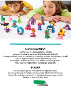 Scorpio uwielbia zakopywać się w piasku i pozostawiać tylko ogon nad ziemią drażniąc każdego, kto przechodzi obok niego. Tego właśnie nauczył się robić w domu na Scorpius odległej, piaszczystej planecie. Hey Clay zawiera 5 pojemników z miękką, pachnącą kreatywną masą oraz kod dostępu do aplikacji. Kolory przedstawione są na opakowaniu, pozwalają na stworzenie wybranej figurki. Część masy pozostaje do ponownego wykorzystania, dzięki czemu można zrealizować swój własny kreatywny pomysł. Masa wysycha na powietrzu w przeciągu 24 godzin.