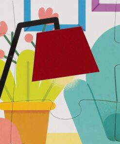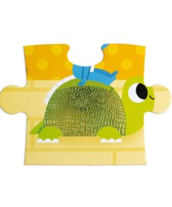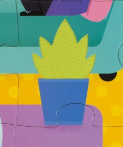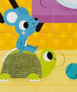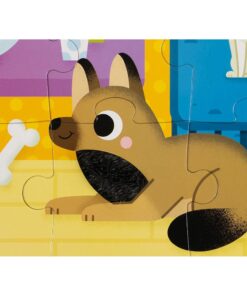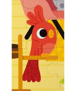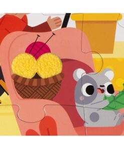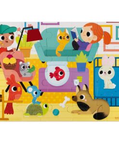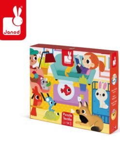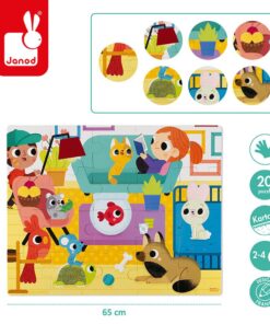 Duży zestaw puzzli sensorycznych francuskiej marki JANOD. Składa się z 20 elementów. Ułożony z nich obrazek przedstawia salon w domu, pełnym zwierząt. Są tu m.in. papuga, pies, żółw, królik, chomik czy rybka. Niektóre elementy ilustracji dziecko może poznać sensorycznie – sierść, pióra, skorupa żółwia czy abażur lampy wykonane zostały z teksturowanych materiałów.