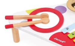 W zestawie znajdują się ponadto dwie drewniane pałeczki, doskonale dopasowane rozmiarami do małej dłoni. W stoliku jest też otwór, w którym można te pałeczki umieścić po skończonej zabawie.