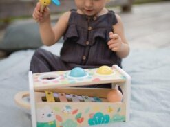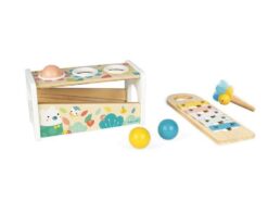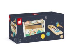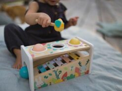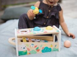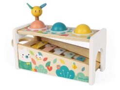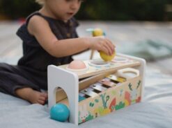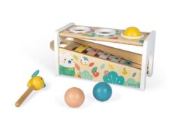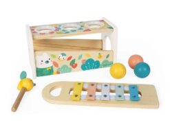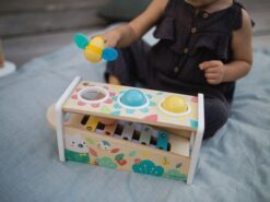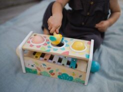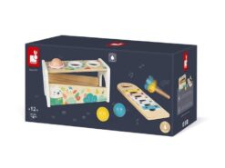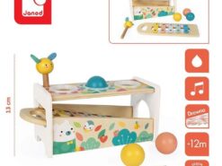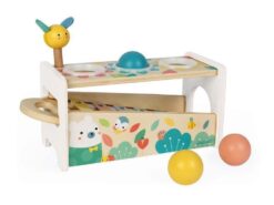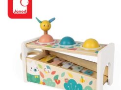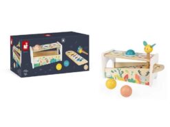 Drewniane cymbałki z kulodromem z serii Pure francuskiej marki JANOD to idealny pierwszy instrument dla dziecka, który pomaga rozwijać słuch, poczucie rytmu oraz zdolności muzyczne, a przy tym wielofunkcyjna zabawka, która nieprędko się znudzi. Konstrukcja ma dwa poziomy – na dolnym, pod kątem umieszczony jest instrument z metalowymi płytkami, a powyżej niego znajdują się trzy otwory na kulki. Za pomocą drewnianej pałeczki, zakończonej żółtą pszczółką z filcowymi skrzydełkami, można zarówno wystukiwać rytm na blaszkach ksylofonu, jak również wbijać do środka kulki, które opadną na klawisze i stoczą się po nich w dół, jak w kulodromie. Cymbałek i kulodromu można również używać osobno. Zabawka wspiera rozwój wyobraźni, koncentracji i koordynacji ruchowej. Ma piękną pastelową kolorystykę, a na pudełku namalowane są charakterystyczne dla kolekcji Pure leśne zwierzątka.
