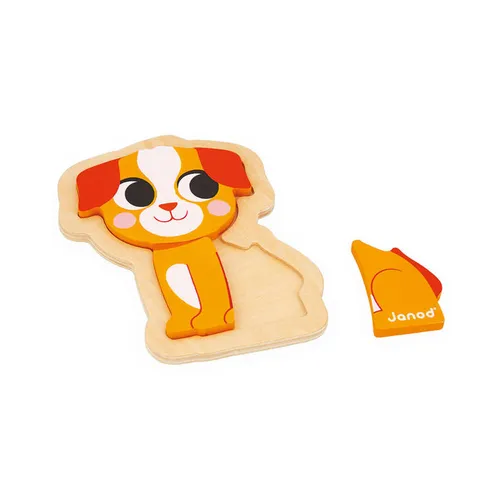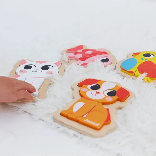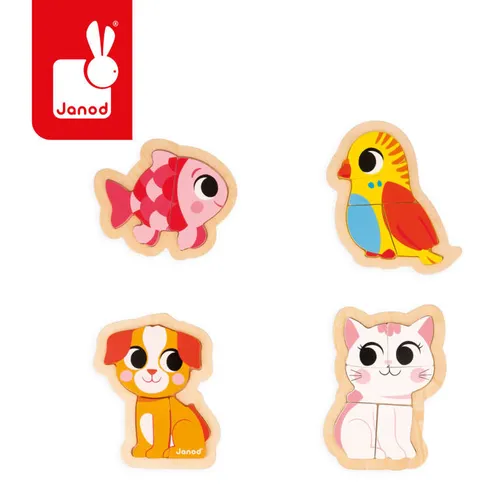 Zestaw Janod – drewniane puzzle progresywne Zwierzęta domowe składa się z 4 układanek o różnym stopniu trudności, ucząc dzieci stopniowo radzić sobie z wyzwaniami.