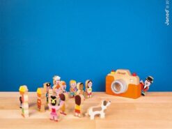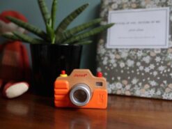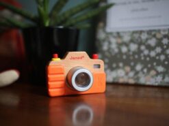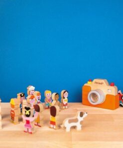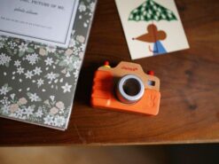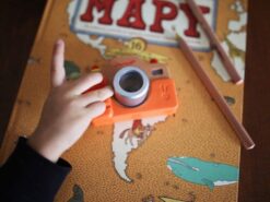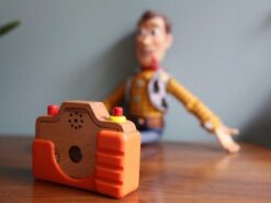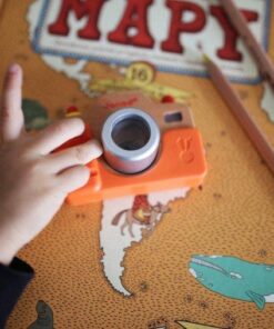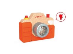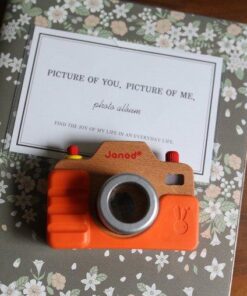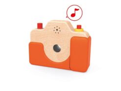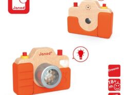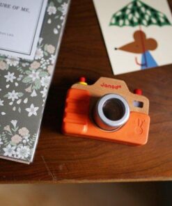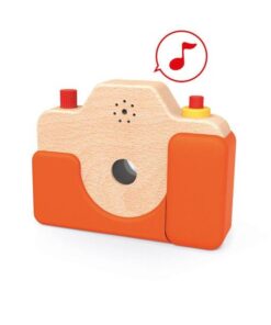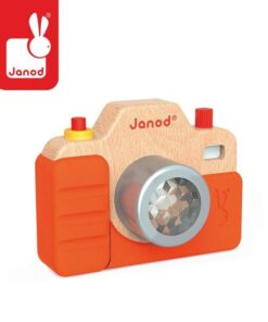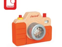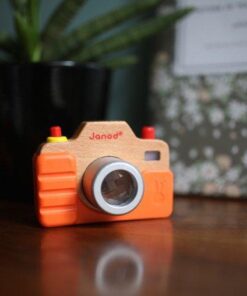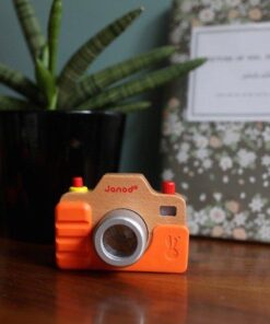 Został bardzo estetycznie wykonany z bukowego drewna, z dbałością o wszystkie detale. Ma silikonową obudowę, obiektyw-kalejdoskop, spust migawki, którego naciśnięcie wywołuje charakterystyczny dla prawdziwego aparatu dźwięk, a nawet lampę błyskową. Zabawa nim to prawdziwa przyjemność, zwłaszcza dla dzieci, które lubią naśladować dorosłych – pomaga im to oswajać się z codziennością i przyswajać zasady zachowań społecznych.