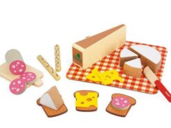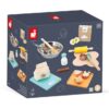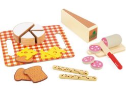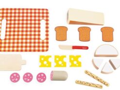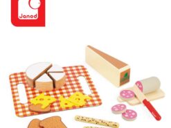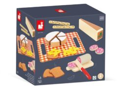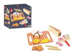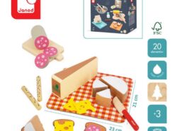 Drewniany zestaw przekąsek francuskiej marki JANOD sprawi mnóstwo radości każdemu dziecku. Pozwoli mu bezpiecznie uczestniczyć razem z rodzicem w codziennych kuchennych czynnościach, poznawać kulinarne tradycje i rozwijać pasję gotowania. W skład 20-elementowego zestawu wchodzą: spora tacka-obrus z solidnego kartonu ze wzorem w modną kratkę, drewniana deska do krojenia oraz nóż i typowe francuskie przysmaki, czyli spory kawałek sera Comte, okrągły ser Camembert z 3 odkrojonymi trójkątami, 3 filcowe plastry sera Ementaler z dziurami, 3 kromki pełnoziarnistego chleba tostowego i 2 chlebowe paluszki z ziarnami oraz tzw. sucha kiełbasa z 3 odkrojonymi plasterkami. Większość elementów wykonana została z drewna FSC (pozyskanego z lasów zarządzanych w zrównoważony sposób) i pomalowana bezpiecznymi dla dzieci farbami. Stanowią świetne uzupełnienie każdej dziecięcej kuchni.