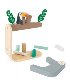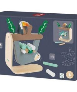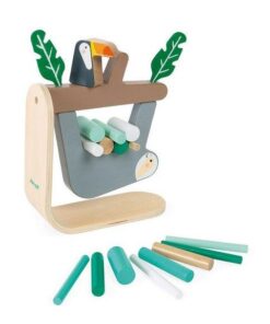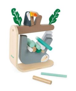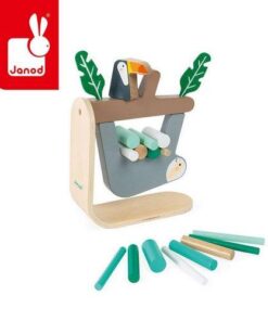 Gra zręcznościowa Leniwiec francuskiej marki JANOD to wspaniała zabawa, zarówno dla kilkorga, jak i jednego dziecka. Zestaw składa się z drewnianej podstawki z gałęzią drzewa (na gałęzi siedzi drewniany tukan i umieszczone są dwa spore filcowe liście), do której od spodu montuje się leniwca oraz 15 drewnianych patyczków różnej wielkości w pięknych pastelowych kolorach (odcieniach bieli i turkusu), które należy umieszczać pomiędzy zwisającym zwierzakiem a gałęzią w taki sposób, by z niej nie spadł. Gracz, który doprowadzi do upadku leniwca – przegrywa. Gra ta ćwiczy koncentrację i zręczność.