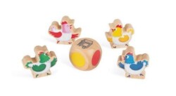 – 4 drewniane pionki mają kształt uroczych kurczaków, a o ich ruchach decyduje wynik rzutu drewnianą kostką ze ściankami w kolorach pól na planszy.