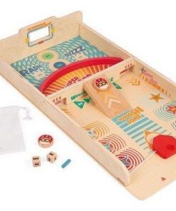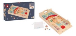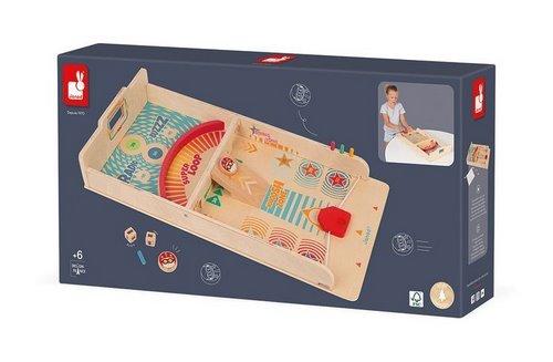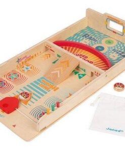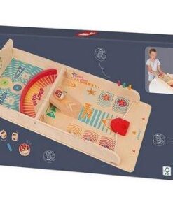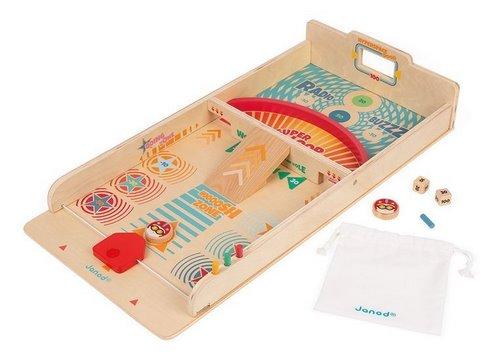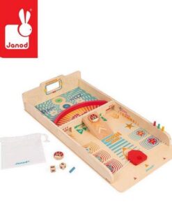 Gra zręcznościowa Bilard holenderski francuskiej marki JANOD to wspaniała zabawa, zarówno dla dwójki dzieci, jak i dziecka oraz rodzica. W skład zestawu wchodzi drewniana plansza z nieco wyższymi bocznymi brzegami, rampą, wieloma punktowanymi polami, trzema okienkami, przez które mogą przelatywać krążki graczy i ściankami-przeszkodami, od których mogą się odbijać oraz gumką z klockiem do wystrzeliwania tych krążków. W komplecie są ponadto: 2 drewniane krążki-zawodnicy, 2 kostki z punktami oraz 4 kołeczki, które kolorami odpowiadają punktowanym polom na planszy (niebieski, żółty, czerwony i zielony). Celem gry jest strzelanie swoim zawodnikiem tak, by trafiał on na jak najwyżej punktowane pole. Gracz, któremu uda się zdobyć najwięcej punktów – wygrywa. Gra ta ćwiczy koordynację ruchową, wspiera relację ręka-oko, uczy cierpliwości i skupienia.
