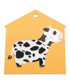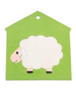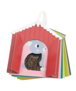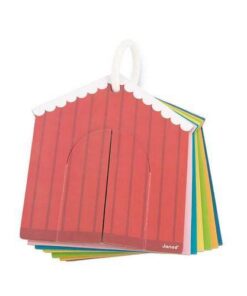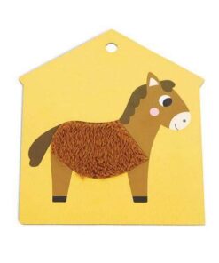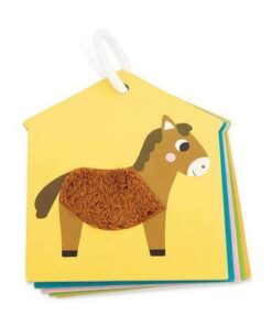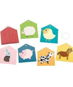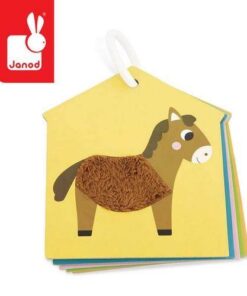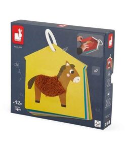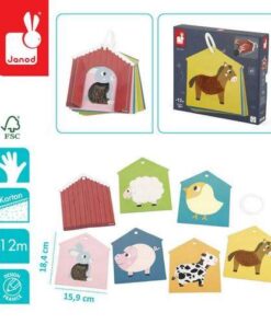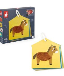 Zestaw kart sensorycznych Farma francuskiej marki JANOD. Składa się z 7 elementów: 1 karty z otwieranym elementem (drzwi stodoły) i 6 kart ze zwierzętami gospodarskimi (owieczka, królik, krowa, świnka, kurczak, koń), których sierść, futro lub skóra wykonane zostały z teksturowanych materiałów. Dotykanie różnorodnych faktur imituje prawdziwe wrażenia empiryczne i rozwija dziecięcy zmysł dotyku. Wzbudza też dodatkowe zainteresowanie zabawką. Karty mają kształt domku (stodoły) i spore, poręczne rozmiary – 15,9 x 18,4 cm, są zawieszone na otwieranym kółku, stąd łatwo zabrać je na spacer lub w podróż, a niełatwo zgubić. Po rozczepieniu i zdjęciu z kółka można je np. rozłożyć na podłodze lub powiesić w pokoju malucha.
