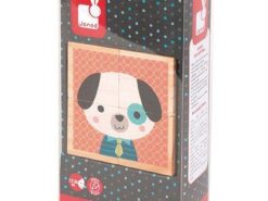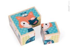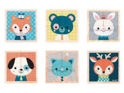 Zestaw składa się z 4 drewnianych klocków. Komplet umożliwia ułożenie 6 różnych obrazków z postaciami zwierząt, mieszkających w lesie i nie tylko: psa, kota, lisa, misia, zająca i jelonka. To doskonała układanka dla małych dzieci na rozpoczęcie przygody z puzzlami.