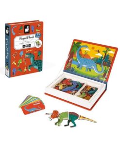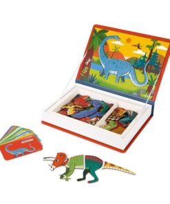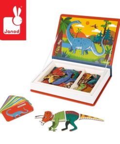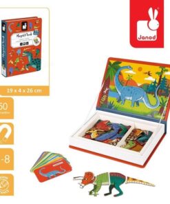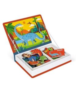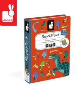Magnetibook Dinozaury z bestsellerowej linii Magnetibook zawiera 40 kolorowych magnesów z elementami ciała (głowami, ogonami łapami itp.) potrzebnymi do stworzenia dinozaurów oraz 10 kart z ilustracjami przedstawicieli wybranych gatunków tych prehistorycznych stworzeń, na których można się wzorować. Magnesy pozwalają również na ułożenie zupełnie nowych, wymyślonych przez siebie zwierząt. To świetna rozrywka dla małych miłośników prehistorycznych gadów, a także wszystkich twórczych dzieci.