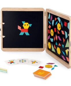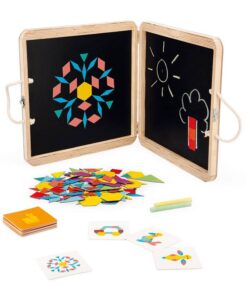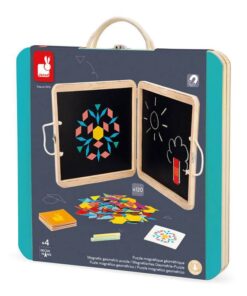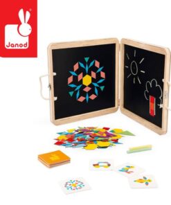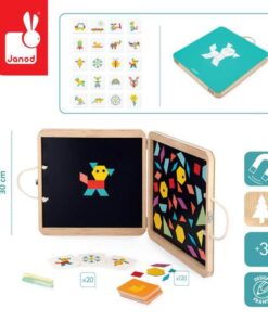 Magnetyczna układanka w drewnianej walizce z wizerunkiem kotka francuskiej marki JANOD to doskonała zabawka, rozwijająca kreatywność i wyobraźnię. W zestawie znajduje się 120 magnesów w geometrycznych kształtach i pięknych, intensywnych kolorach, które dziecko może układać na obu wewnętrznych ściankach walizki. Dodatkowo zawiera 20 kart z grafikami m.in. zwierząt do odtworzenia na planszy oraz kredę – ponieważ owe wewnętrzne ścianki mogą też pełnić rolę tablicy. Zabawka będzie służyć dziecku przed długi czas i nieprędko się znudzi, bo daje wiele możliwości kreacji. Jest pięknie wykonana, co rozbudza zmysł artystyczny, a ponadto trenuje spostrzegawczość oraz sprawność manualną u dziecka. To świetna rozrywka dla małych konstruktorów, a także wszystkich twórczych dzieci.