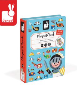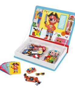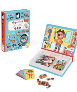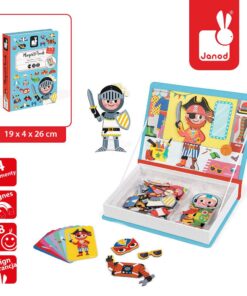 Magnetyczna układanka Magnetibook francuskiej marki JANOD zawiera 36 kolorowych magnesów z elementami chłopięcych strojów, dzięki którym można się stać np. piratem, kosmonautą czy rycerzem oraz 8 kart z przykładowymi pomysłami przebrania, które można stworzyć z magnesów. Zabawa polega na układaniu na planszy magnesów, które dziecko może dowolnie łączyć we wzory. Plansza magnetyczna jest jednocześnie wewnętrzną stroną okładki. Dwie przegródki wewnątrz pomagają utrzymać porządek w magnesach i kartach. Układanka ta będzie służyć przed długi czas i nieprędko się znudzi, bo daje wiele możliwości kreacji.