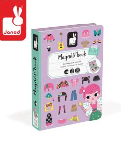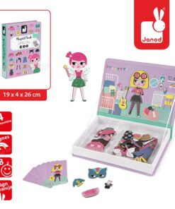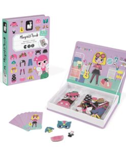 Magnetibook Przebrania Dziewczynki to zestaw 46 kolorowych magnesów z elementami dziewczęcych strojów, dzięki którym można się stać np. superbohaterką, wróżką czy gwiazdą rocka. Dwie przegródki wewnątrz opakowania pomagają utrzymać porządek w magnesach i kartach.
