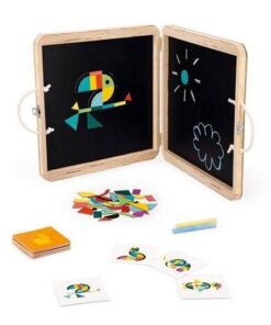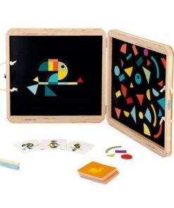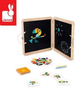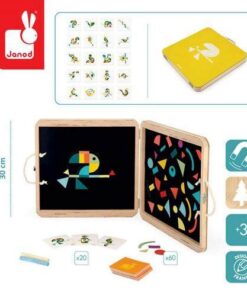 Magnetyczna układanka w drewnianej walizce z wizerunkiem tukana francuskiej marki JANOD to doskonała zabawka, rozwijająca kreatywność i wyobraźnię. W zestawie znajduje się 60 magnesów w geometrycznych kształtach i pięknych, intensywnych kolorach, które dziecko może układać na obu wewnętrznych ściankach walizki. Dodatkowo zawiera 20 kart z grafikami m.in. zwierząt do odtworzenia na planszy oraz kredę – ponieważ owe wewnętrzne ścianki mogą też pełnić rolę tablicy. Zabawka będzie służyć dziecku przed długi czas i nieprędko się znudzi, bo daje wiele możliwości kreacji. Jest pięknie wykonana, co rozbudza zmysł artystyczny, a ponadto trenuje spostrzegawczość oraz sprawność manualną u dziecka. To świetna rozrywka dla małych konstruktorów, a także wszystkich twórczych dzieci.