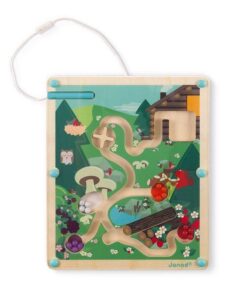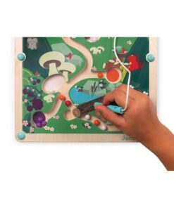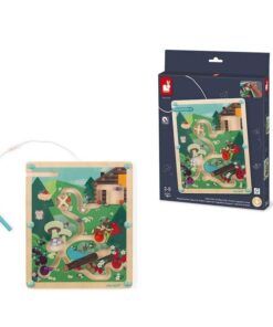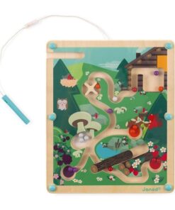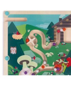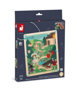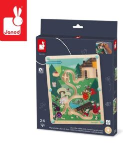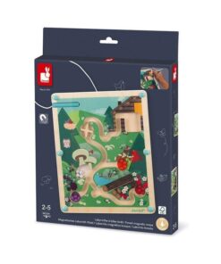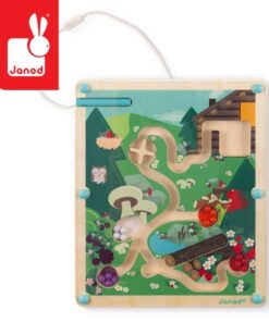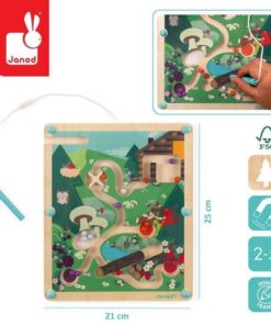 Magnetyczny labirynt Las francuskiej marki JANOD to doskonała zabawka manipulacyjna dla małych dzieci, która rozwija m.in. chwyt i koordynację ręka-oko. Labirynt korytarzy znajduje się na drewnianej planszy z grafiką polany między drzewami i leśniczówki, za bezpieczną plastikową szybką. Zabawa polega na przesuwaniu drewnianych kulek za pomocą drewnianego patyczka zakończonego magnesem. Patyczek umieszczony jest na sznurku przy planszy, a pod szybką znajduje się również miejsce na schowanie go. Kulek jest w sumie 12 – po 3 kulki w 4 różnych kolorach (białe, pomarańczowe, czerwone i fioletowe). Zadaniem malca jest poprzesuwać je w miejsca, odpowiadające im kolorem (tam, gdzie rosną fioletowe jeżyny, brązowe orzechy, czerwone poziomki i białe pieczarki), a następnie – odprowadzić do domku. Po drodze kulki muszą jeszcze pokonać przeszkody w postaci obracanego krzyżyka oraz kłody. Zabawka jest pięknie wykonana, co dodatkowo zachęca dziecko do podjęcia wyzwania. To także świetny sposób na naukę o leśnej florze i faunie.