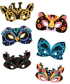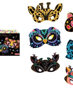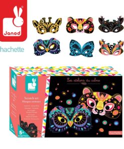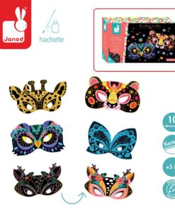 Zestaw kreatywny Do zdrapywania Maski zwierząt francuskiej marki JANOD zawiera 5 masek z solidnego kartonu – sarny, żyrafy, sowy, pantery i motyla. Maski są czarne, jedynie z kolorowymi konturami elementów, które ukazują się stopniowo w efekcie zdrapywania wierzchniej warstwy. Do zestawu dołączony jest plastikowy patyczek do zdrapywania oraz 5 gumek do przewiązania przez boczne otwory masek, dzięki którym gotowe, bajecznie kolorowe maski można nosić jako przebranie.