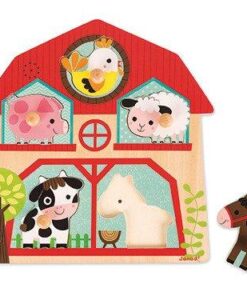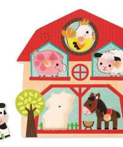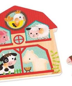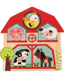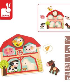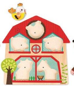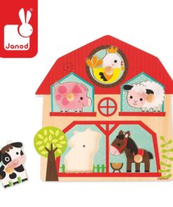 Drewniane puzzle muzyczne Mieszkańcy Farmy francuskiej marki JANOD to wspaniała pierwsza układanka dla malucha. Zestaw składa się z 6 elementów: 5 drewnianych zwierzątek (świnka, owca, ptaszek, krówka i konik) oraz drewnianej planszy-zagrody z wgłębieniami o kształtach tych właśnie zwierząt.
