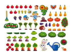 W zestawie jest aż 70 magnesów, przedstawiających różne rośliny, zwierzęta i przedmioty, które można spotkać w ogródku – m.in.: różne gatunki uprawnych warzyw i owoców, kwiaty, królika, ślimaka, kreta, stracha na wróble, budkę dla ptaków, ul, grabie czy konewkę.