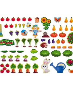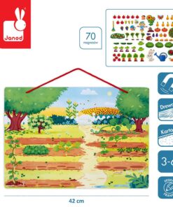 W zestawie jest aż 70 magnesów, przedstawiających różne rośliny, zwierzęta i przedmioty, które można spotkać w ogródku – m.in.: różne gatunki uprawnych warzyw i owoców, kwiaty, królika, ślimaka, kreta, stracha na wróble, budkę dla ptaków, ul, grabie czy konewkę.