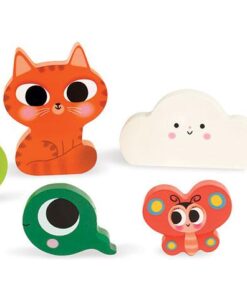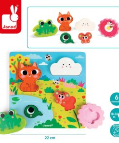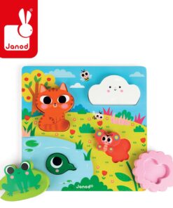 Elementy należy dopasować w odpowiednie miejsca na drewnianej, kolorowej planszy, przedstawiającej łąkę nad stawem. Jest to idealny wstęp do nauki układania prawdziwych puzzli. Ponadto klocki 3D mogą być także wspaniałymi figurkami do zabawy.