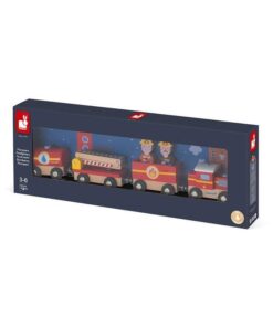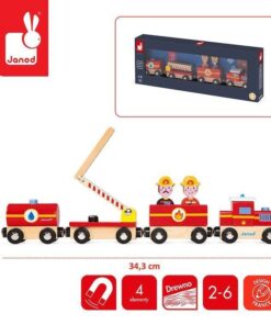Pociąg drewniany Straż pożarna z serii Story francuskiej marki Janod to idealny prezent dla każdego dziecka. Zestaw składa się 4 elementów, łączonych między sobą na magnes: lokomotywy oraz 3 wagonów: cysterny z wodą, wagonu z wysięgnikiem oraz wagonu przewożącego dwóch strażaków. Kolejka jest perfekcyjnie wykonana, utrzymana w kolorach czerwieni i żółci. Zestaw łączy się z innymi z serii Story. Również sam w sobie pozwala na tworzenie wielu scenariuszy zabaw ze strażakami w roli głównej.