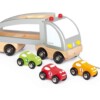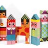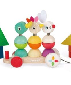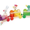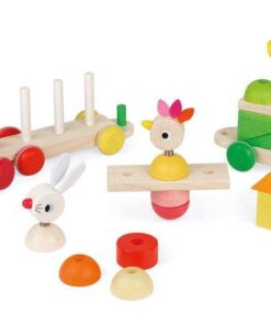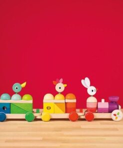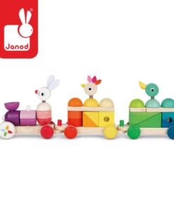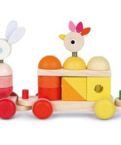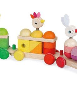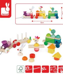 Drewniany pociąg do ciągnięcia francuskiej marki JANOD składa się z trzech wagonów na kółkach – na każdym z elementów znajdują się po trzy drążki, na które można nakładać dołączone do zestawu kolorowe klocki o geometrycznych kształtach.