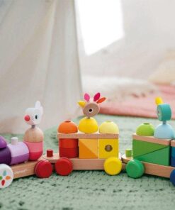 Pociąg to idealna zabawka 2w1 – zarówno zabawka do ciągnięcia, jak klocki do tradycyjnej zabawy. Wśród klocków znajdują się także sympatyczne postacie zajączka, kurczaczka i kaczki – małych pasażerów pociągu. Podczas prowadzenia zwierzątka kiwają główkami na szyjach-sprężynkach. Zabawka do ciągnięcia będzie doskonałym towarzyszem pierwszych kroków maluszka. Jest lekka i zwrotna, a jej miękkie, wykończone gumą kółka, nie porysują podłogi w domu.