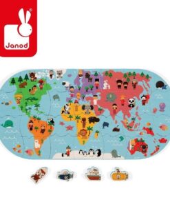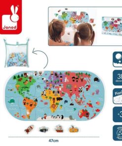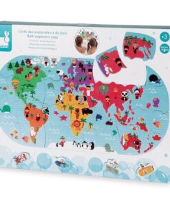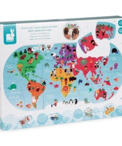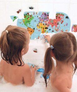 Puzzle do kąpieli Mapa świata to aż 28 puzzli z wodoodpornego tworzywa. Po ułożeniu przedstawiają kolorową mapę wszystkich kontynentów z ich mieszkańcami i charakterystycznymi dla danego regionu zwierzętami.