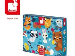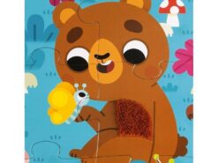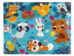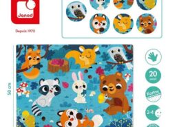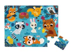 Duży zestaw puzzli sensorycznych francuskiej marki JANOD. Składa się z 20 elementów. Ułożony z nich obrazek przedstawia leśną polanę, pełną zwierząt. Są tu m.in. sowa, lis, niedźwiadek, zając, motyl czy jelonek. Niektóre elementy ilustracji dziecko może poznać sensorycznie – futerka na brzuszkach i ogonach, skrzydła motyla, grzbiet jelonka czy fragment krzaczka wykonane zostały z różnych materiałów. Dotykanie różnorodnych tekstur imituje prawdziwe wrażenia empiryczne i rozwija dziecięcy zmysł dotyku. Wzbudza też dodatkowe zainteresowanie układanką. Pojedyncze puzzle mają spore rozmiary, a obrazek po ułożeniu ma 65 na 50 cm. Puzzle zostały wykonane z trwałego kartonu, a ich kształty ułatwiają dziecku łączenie elementów.