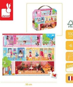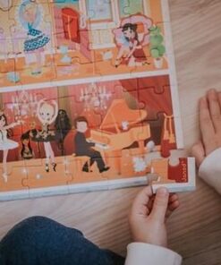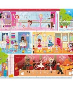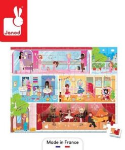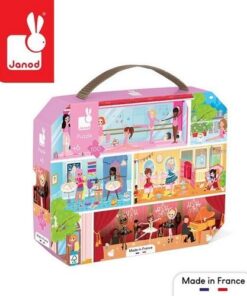Zestaw puzzli w walizce Akademia tańca francuskiej marki JANOD składa się ze 100 elementów, po ułożeniu tworzących piękny, bogaty w szczegóły obrazek, przedstawiający trzy kondygnacje szkoły baletowej z salą ćwiczeń, toaletą, garderobą, tarasem oraz sceną, na której odbywa się występ. Puzzle wykonane są z solidnego kartonu. Zaprojektowane i wyprodukowane we Francji. Zapakowane w estetyczną walizeczkę z rączką. Idealnie nadają się na prezent.