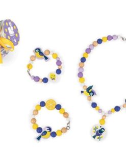 Zestaw kreatywny Drewniane koraliki Sikorki francuskiej marki JANOD zawiera 220 drewnianych koralików w dwóch rozmiarach, w kolorach: granatowym, fioletowym, lawendowym, żółtym, białym oraz naturalnego drewna, a także 12 drewnianych zawieszek różnej wielkości i w różnych kształtach, z kolorowymi obrazkami, m.in. z postaciami sikorek. W zestawie znajduje się ponadto 5 metalowych zapinek oraz elastyczna nylonowa linka do nawlekania koralików. Dzięki temu można z nich tworzyć np. bransoletki lub naszyjniki. Po skończonej pracy dzieła dziecka mogą mu jeszcze długo służyć jako ozdoby lub podarunki dla bliskich. Zestaw zaprojektowano we Francji. Zapakowany jest w praktyczny i poręczny słoiczek z tworzywa z metalową nakrętką i ozdobną wstążką. Sprawdzi się on również jako pojemniczek na dziecięce skarby. Idealnie nadaje się na prezent.