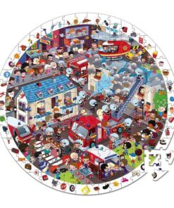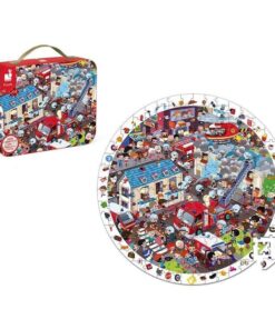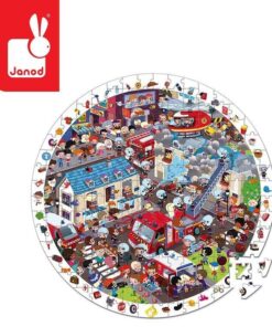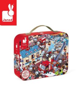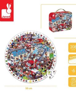 Puzzle obserwacyjne Straż pożarna marki Janod to zabawka idealna dla starszych dzieci, ponieważ łączy ze sobą naukę i zabawę. Puzzle składają się z 208 elementów, które po ułożeniu przedstawiają akcję straży pożarnej. Dodatkowo w ramce puzzli znajdują się pojedyncze elementy, które należy odszukać na obrazku. Opakowanie puzzli ma formę walizeczki z uchwytem, dzięki czemu idealnie nadaje się na prezent. Puzzle wykonane zostały z trwałego kartonu z idealnymi kształtami, które pozwalają dziecku na łatwe łączenie elementów. Zaprojektowane zostały we Francji.