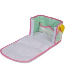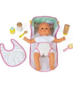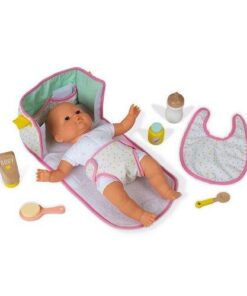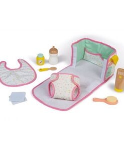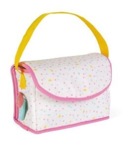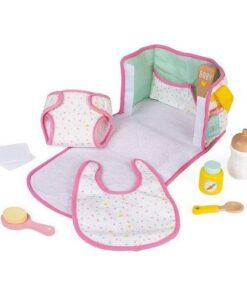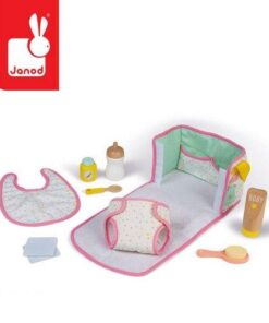 Zestaw-torba do przewijania z akcesoriami francuskiej marki JANOD to idealna zabawka dla dzieci lubiących odtwarzać codziennie sytuacje, takie jak opieka nad niemowlakiem, w tym np. karmienie, czy zmienianie pieluszki. Torba posiada szeroki pasek do noszenia na ramieniu, ma szeroką klapę na rzep, która po rozłożeniu pełni rolę maty do przewijania. W zestawie znajdują się: