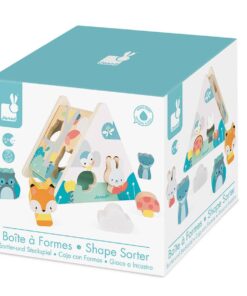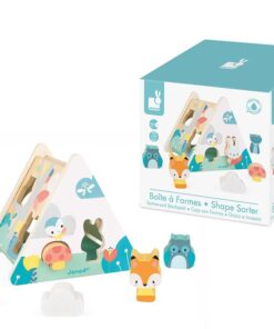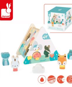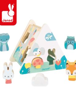 Zestaw składa się z drewnianej bryły o bokach w kształcie trójkąta (dominują na nim kolory biały i niebieski, jak w całej serii Pure), na której ścinach znajduje się 6 otworów w różnych kształtach (m. in. grzybka, chmurki, sowy czy królika) oraz z 6 drewnianych klocków w kształtach, odpowiadającym wspomnianym otworom. Wrzucone klocki bardzo łatwo wyjąć ze środka, bo jeden bok sortera jest częściowo otwarty.