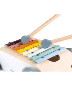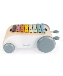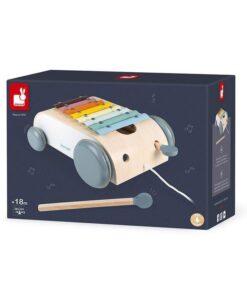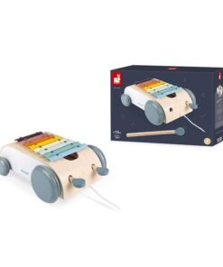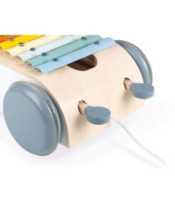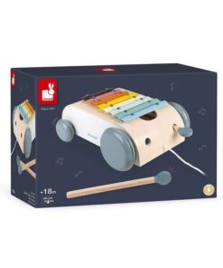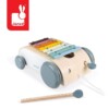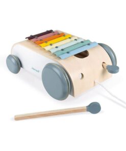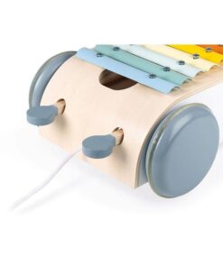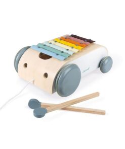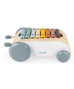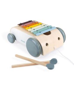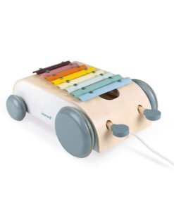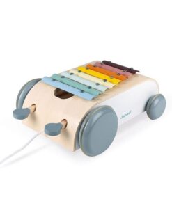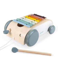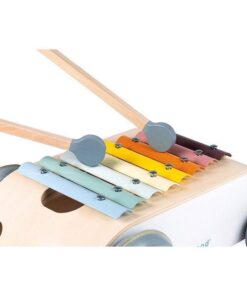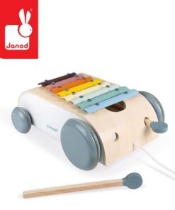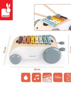 Wózek cymbałki do ciągnięcia 8 tonów z serii Sweet Cocoon francuskiej marki JANOD to wielofunkcyjna zabawka, która rozwija u dziecka, m.in. wrażliwość muzyczną, poczucie rytmu, zachęca do nauki gry na instrumentach i stawiania pierwszych kroków, ćwiczy małą motorykę, pamięć oraz koncentrację. Cymbałki mają 8 metalowych płytek, umieszczonych na podeście z giętego drewna o zaokrąglonych brzegach oraz dwie drewniane poręczne pałeczki, które można umieścić w specjalnych otworach na przodzie pojazdu. Zabawka jest estetycznie wykonana i ma piękne, jakby „dorosłe” kolory: jasnego drewna i szarości z elementami (płytkami) w odcieniach m.in. pastelowego niebieskiego, różu, pomarańczu czy bieli. Będzie zarówno świetnym pierwszym instrumentem dziecka, jak i towarzyszem jego pierwszych kroków. Cymbałki można prowadzić na sznureczku, a szeroki rozstaw 4 kół w dwóch wielkościach zapewnia im stabilność. Co więcej, kółka wykończono gumą, dzięki czemu nie rysują podłogi w domu.