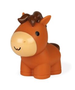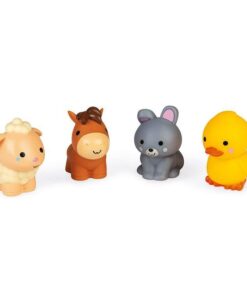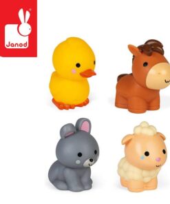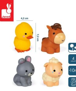Zestaw uroczych zwierzątek z farmy francuskiej marki JANOD to 4 wytrzymałe zabawki z wodoodpornego tworzywa. W skład kompletu wchodzą: konik, kaczuszka, owieczka i królik. Wszystkie są poręczne i przyjemne w dotyku. Ściśnięte pod wodą, napełniają się, a po ich ponownym naciśnięciu, tryskają wodą. Mają intensywne, ładne kolory. Tworzenie opowieści o ich przygodach to doskonały sposób na wyciszenie i idealny umilacz czasu, spędzanego w wannie. Zabawkę zaprojektowano we Francji. Zapakowane jest w estetyczne pudełko z uchwytem. Idealnie nadaje się na prezent.
