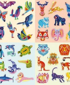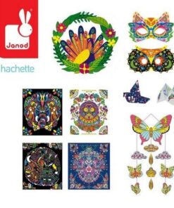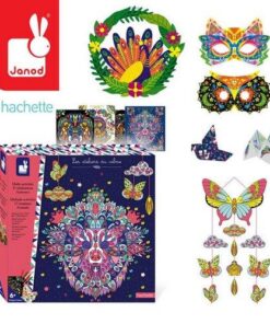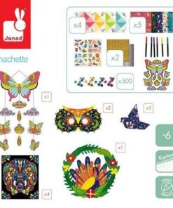 Multi-zestaw kreatywny dekoracje Zwierzęta francuskiej marki JANOD zawiera różnorodne, kolorowe elementy, z których można utworzyć aż 17 przepięknych ozdób do dziecięcego pokoju! W zestawie do wykonania są: łapacz snów z motylami, papierowy wieniec 3D z pawiem, 2 maski, 4 obrazki do pokolorowania fluorescencyjnymi flamastrami, 5 zwierzątek origami, 4 wróżby piekło-niebo. W jego skład wchodzą wszystkie elementy, niezbędne do ich wykonania, w tym plansze, maski, części łapacza, jak również: 4 arkusze papieru i zestaw naklejek do stworzenia wróżb, wzorzyste kwadratowe arkusze origami wraz z instrukcjami składania, 5 odblaskowych mazaków, 2 arkusze piankowych naklejek i 500 cekinów w 4 kolorach. Składanie origami, sklejanie i naklejanie, kolorowanie, ozdabianie cekinami itp. to dla dziecka długie godziny angażującej i jednocześnie uspokajającej zabawy. Gotowe dzieła mogą stać się powodem do dumy i wspaniałymi dekoracjami dziecięcego pokoju.