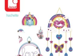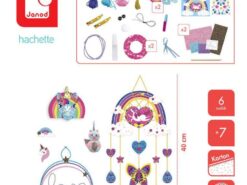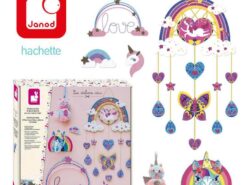Multi-zestaw kreatywny dekoracje Tęcza francuskiej marki JANOD zawiera różnorodne, kolorowe elementy, z których można utworzyć aż 6 przepięknych ozdób do dziecięcego pokoju! W zestawie do wykonania są: łapacz snów, trofeum 3D z jednorożcem, zawieszka-tęcza z drucianym napisem, zawieszka z pomponów – kotek oraz dwie broszki: jednorożec i tęcza. W jego skład wchodzą: klej w tubce, tubka brokatu, plansza ze wstępnie naciętymi elementami łapacza, 2 plansze z wstępnie wyciętymi elementami trofeum, arkusz z przylepnymi kryształkami, 2 arkusze filcu (1 brokatowy), aluminiowy drucik, 3 małe motki i solidne kartonowe obręcze, wokół których należy je owijać zgodnie z instrukcją, żeby zrobić pompony, 2 koraliki, 2 agrafki, wstążka i drewniana szpatułka – do zdrapywania wierzchniej warstwy na powierzchniach, przeznaczonych do ozdabiania czy równomiernego rozprowadzania brokatu. Plecenie, wyginanie, naklejanie drobnych elementów, ozdabianie brokatem, zdrapywanie itp. to dla dziecka długie godziny angażującej i jednocześnie uspokajającej zabawy. Gotowe bajeczne dzieła mogą stać się powodem do dumy i wspaniałymi dekoracjami dziecięcego pokoju.
