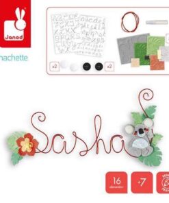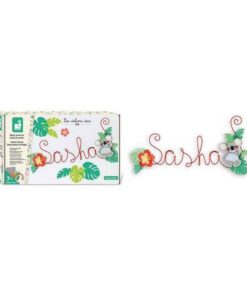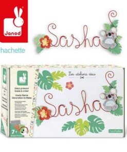 Zestaw kreatywny Dekoracja z imieniem Koala francuskiej marki JANOD zawiera długi giętki drucik, 2 czarne koraliki, 6 arkuszy filcowych (w tym 1 brokatowy) ze wstępnie wyciętymi elementami, klej w tubce oraz dwustronny plakat, ilustrujący sposoby wyginania drucika w wielkie i małe litery. Do zestawu dołączona jest szczegółowa instrukcja, jak wykonać z tych części spersonalizowaną ozdobę z egzotycznymi liśćmi i sympatycznym misiem koalą. Wyginanie, przyklejanie, komponowanie kolorów to dla dziecka długie godziny angażującej i jednocześnie uspokajającej zabawy, a gotowe imię będzie powodem do dumy i wspaniałym elementem dekoracyjnym dziecięcego pokoju.