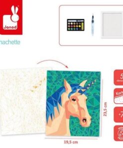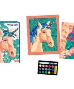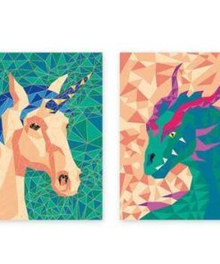 Zestaw kreatywny Malowanie po numerach Fantastyczne stworzenia z serii Misterix francuskiej marki JANOD zawiera 2 plansze-obrazki z tymi stworzeniami: smokiem i jednorożcem. Plansze są białe (jedna ma wyróżnione złote elementy), podzielone na ponumerowane trójkątne przestrzenie, a ilustracja ujawnia się na nich dopiero w trakcie malowania. Zadanie polega na precyzyjnym – za pomocą dołączonego specjalnego cienkiego pędzelka ze zbiornikiem wody – wypełnieniu trójkątów farbą, zgodnie z instrukcją numeryczną. W palecie akwareli znajduje się 15 kolorów i mała gąbka do pochłaniania nadmiaru wody. W komplecie jest też ramka na skończony obrazek, którą również można pomalować na wybrany kolor. Malowanie po numerach to dla dziecka godziny angażującej i jednocześnie uspokajającej, wyciszającej zabawy, a gotowe obrazki staną się wspaniałą dekoracją dziecięcego pokoju.